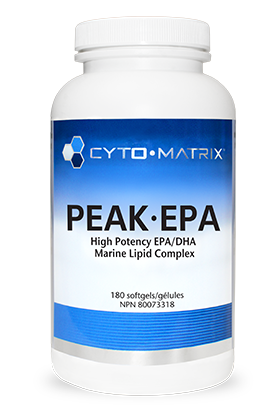 Un défi qui se pose avec la supplémentation en acides gras oméga-3 est la mauvaise observance. La plupart des suppléments nécessitent de nombreuses capsules ou cuillères à café par jour pour obtenir une dose d'EPA et de DHA fondée sur des preuves. Le Peak-EPA de Cyto-Matrix résout ce problème en fournissant 700 mg d'EPA et 350 mg de DHA dans une seule gélule. Ces acides gras oméga-3, provenant de sardines sauvages, de saumon et d'anchois, se trouvent sous la forme d'ester éthylique bien documentée, permettant une livraison fondée sur des preuves, extrêmement concentrée et rentable.